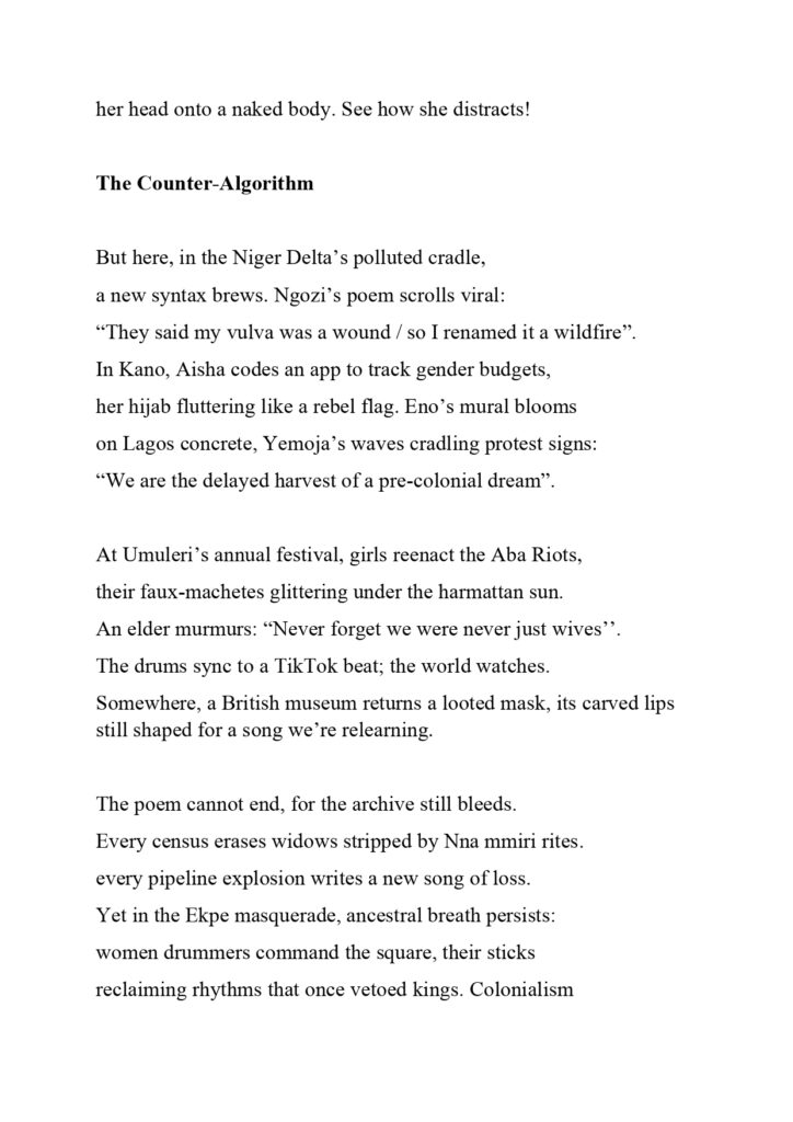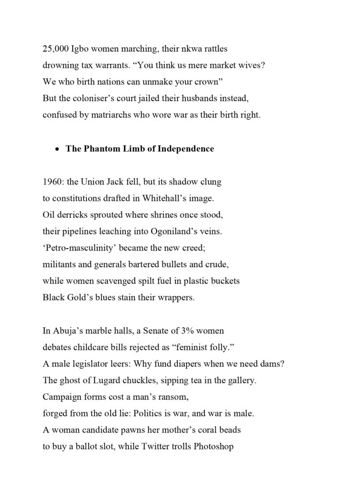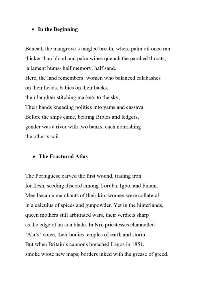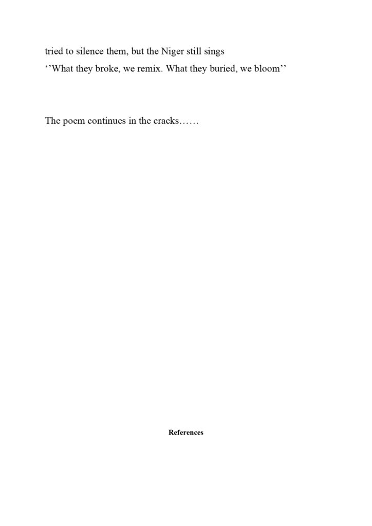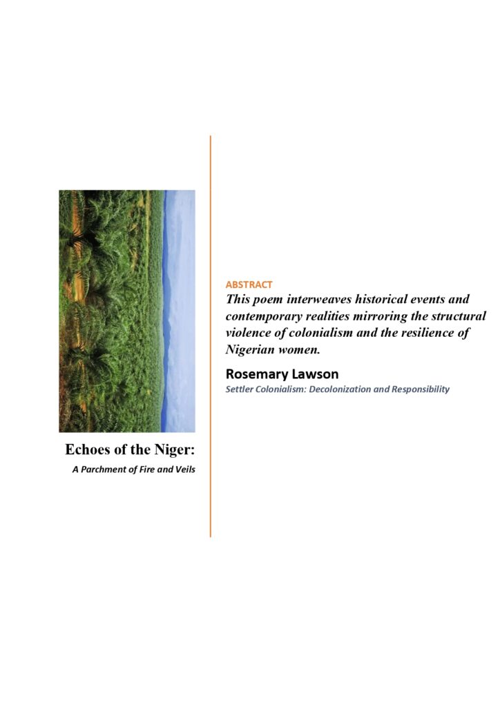 One assignment that really brought out my not-too-creative side was from the Settler Colonialism: Decolonisation and Responsibility class with Dr Robin and Dr Cooke. They came into the class with a wild out-of-the-box type of teaching. At first, I didn’t understand the assignment, which was identifying a place and defining a place. Many of my coursemates drew or brought something to the class, but I went into my archives to fish out some pictures I took when I worked in the creeks of the Niger Delta back home in Nigeria. To me, it was places that shaped my idea, thoughts, perspectives and outlook on the word “Justice” The mapping of the place assignment led me to do a poetry piece as my final project for the course. I wanted to tell the story of women in Nigeria from the pre-colonial period to the present democratic dispensation from a point of strength and resilience. I titled the poem The Echoes of the Niger.